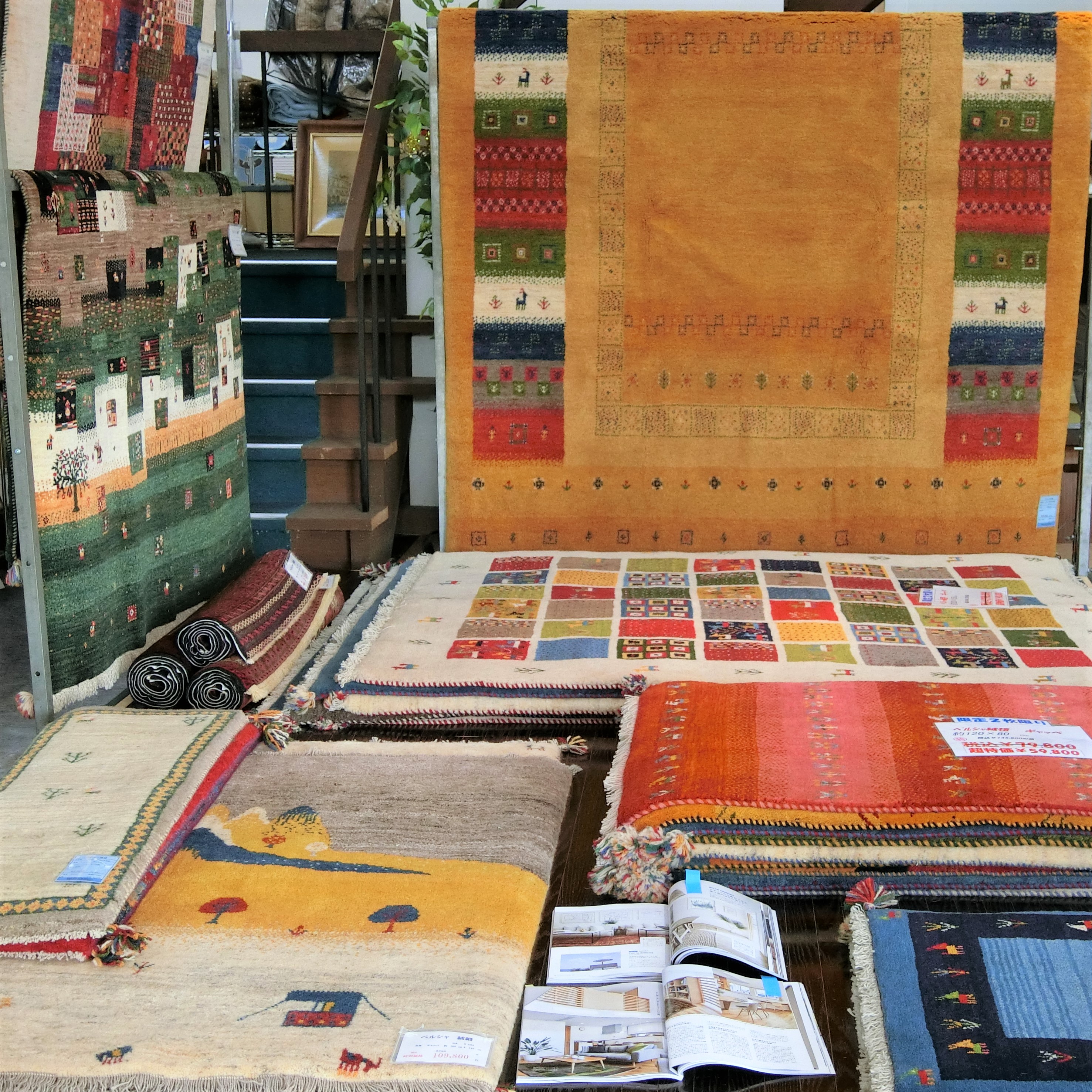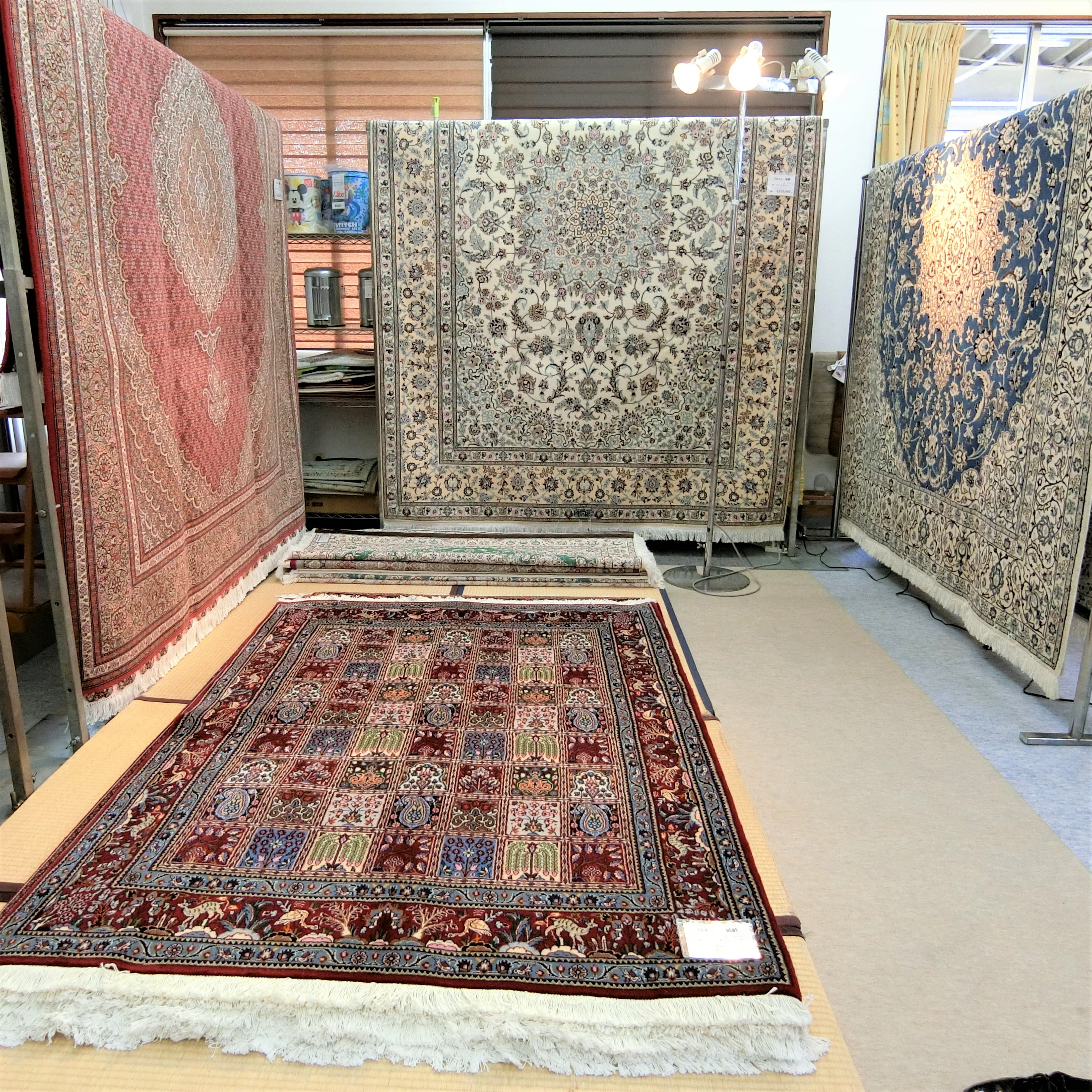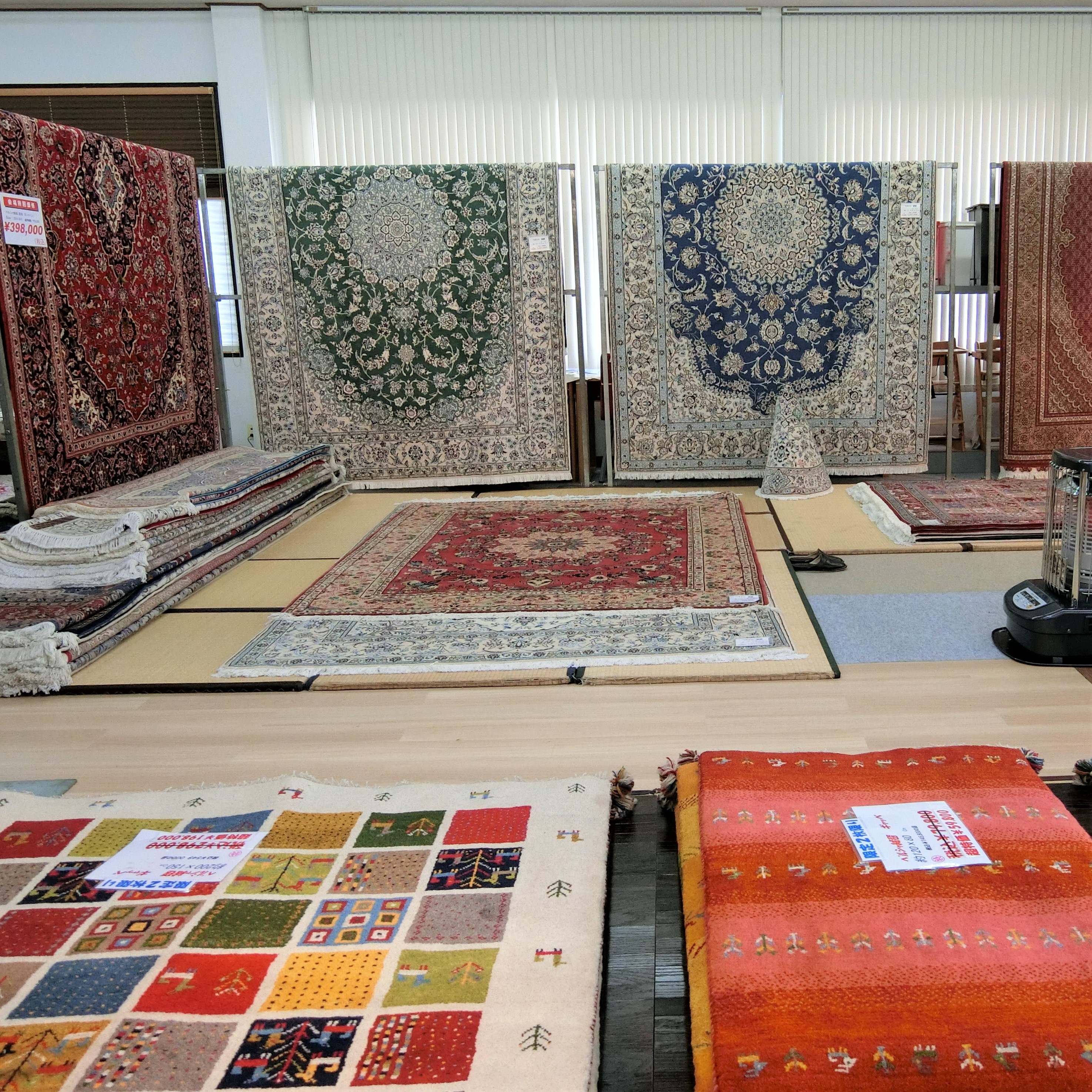同時開催で手織り絨毯・ギャベ・インポートラグも60点展示し、ご自宅に持参して試し敷きも致します。「実際家で見ないとイメージできない」「上質な物が欲しいので実物が見たい」という方はぜひご来店ください。